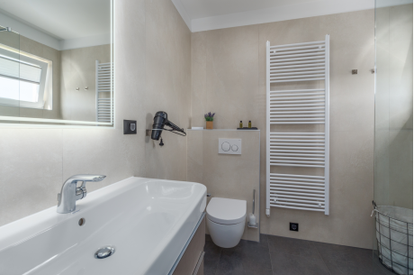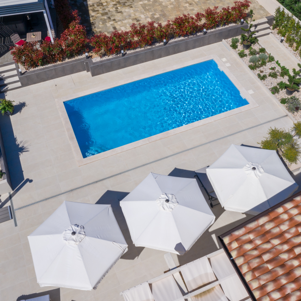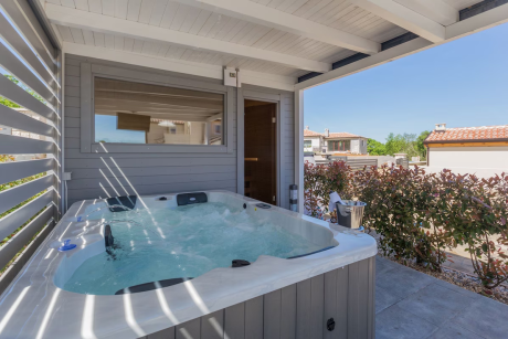 Mit 32 qm bietet der private Außenpool ausreichend Platz zum Schwimmen und Erfrischen. Im Jacuzzi mit warmem Wasser können Sie die Seele baumeln lassen und für kühlere Tage steht eine großzügige Sauna zur Verfügung.