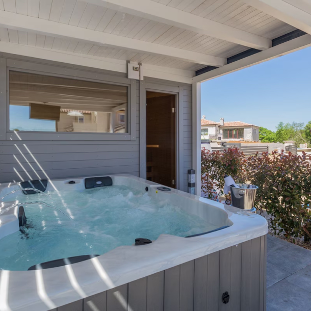 Mit 32 qm bietet der private Außenpool ausreichend Platz zum Schwimmen und Erfrischen. Im Jacuzzi mit warmem Wasser können Sie die Seele baumeln lassen und für kühlere Tage steht eine großzügige Sauna zur Verfügung.